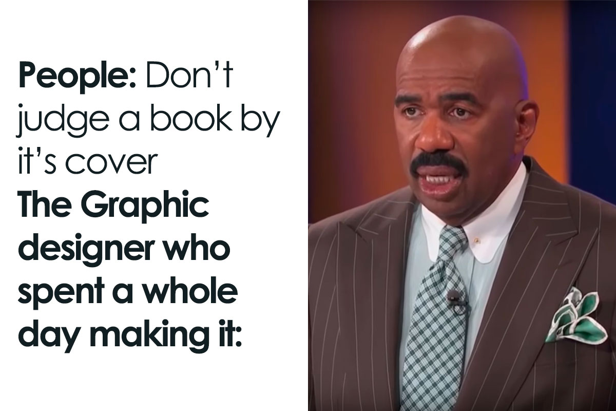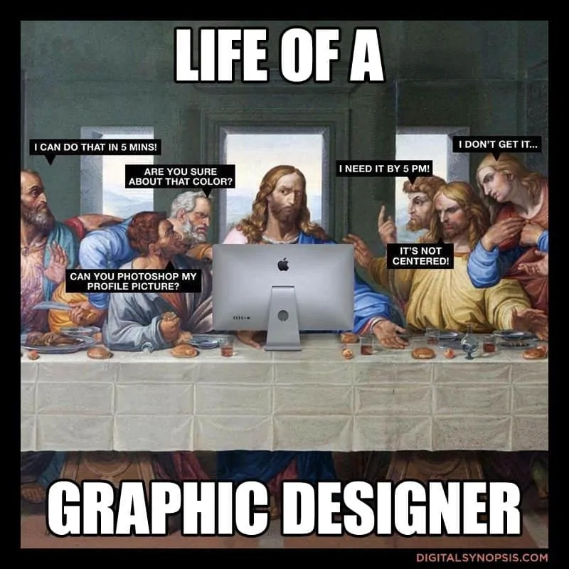 This meme satirizes the struggles of real graphic designers by juxtaposing an overly simplistic design with phrases like, “I worked all night on this.”