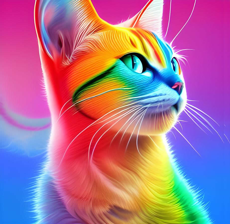 A poorly cropped image of a rainbow-colored cat over a chaotic background, often with Comic Sans text. It plays on the charm of blending internet meme culture with graphic design.