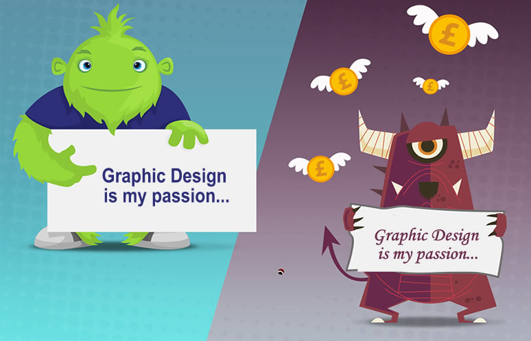 A side-by-side comparison of a polished, professional design next to a deliberately bad version, labeled “Graphic Design is My Passion.”